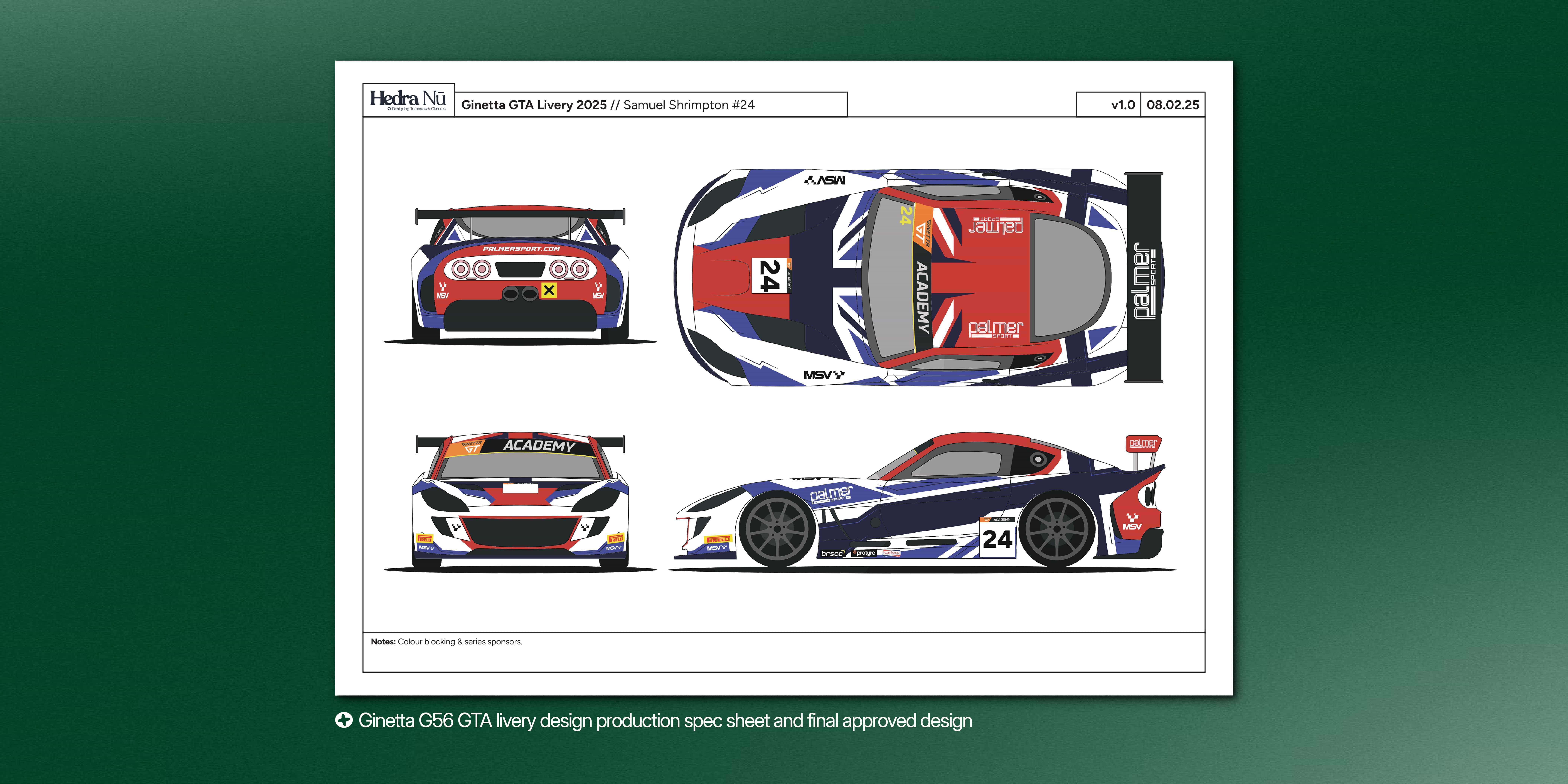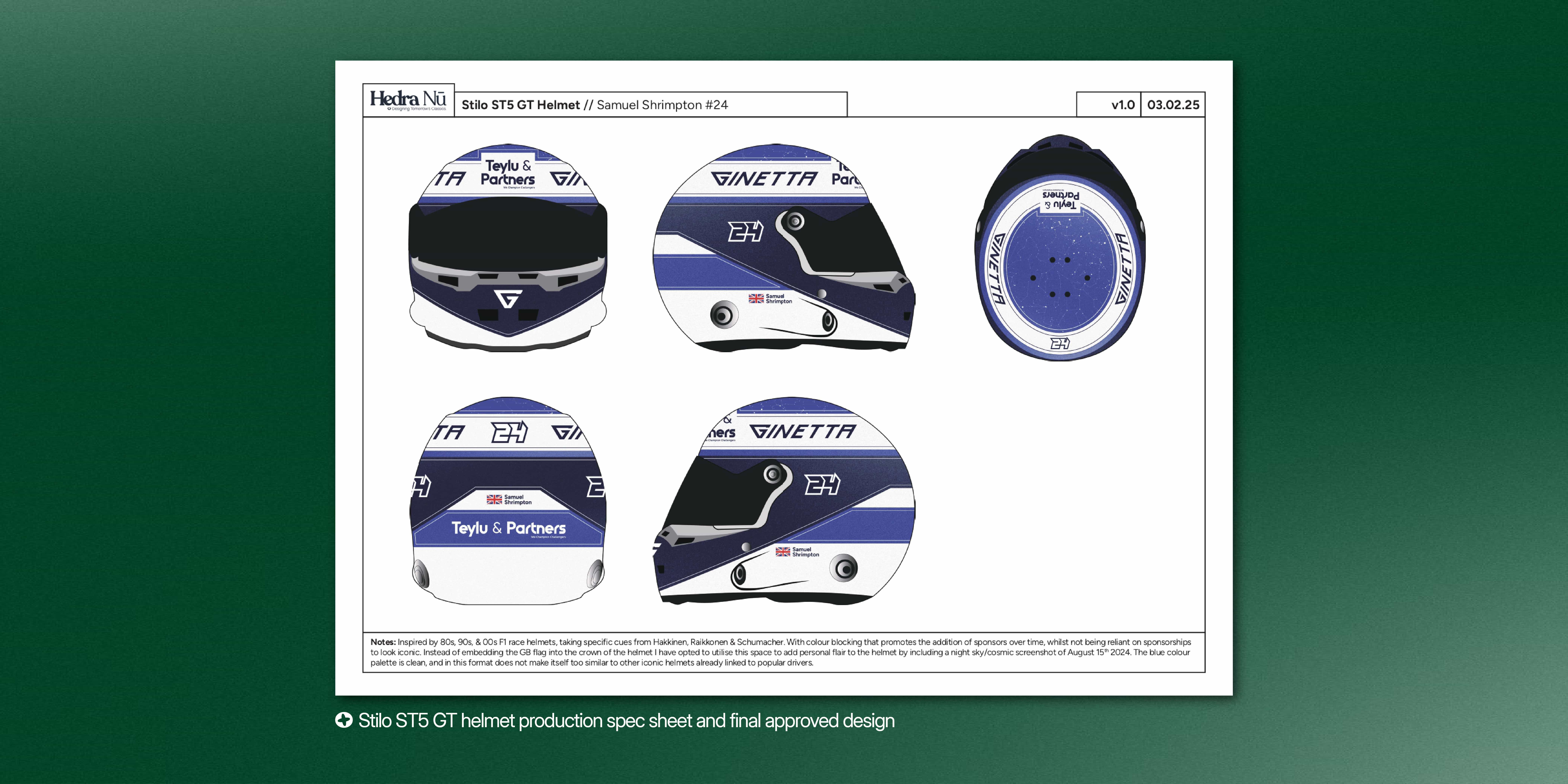In 2025 I designed the helmet and car livery for the Rookie Championship Winner who races in Ginetta GT Academy Championship (support series for the British GT Championship).